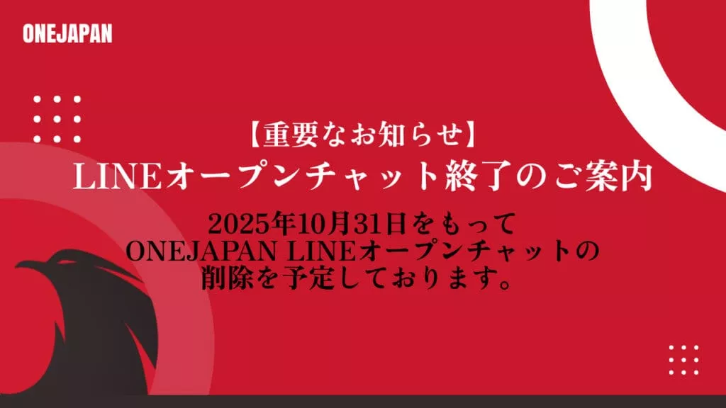 運営上の都合により、2025年10月31日をもってONEJAPAN LINEオープンチャットの削除を予定しております。この間、迷惑の投稿が発生した場合は予定より前に削除いたしますのでご了承ください。