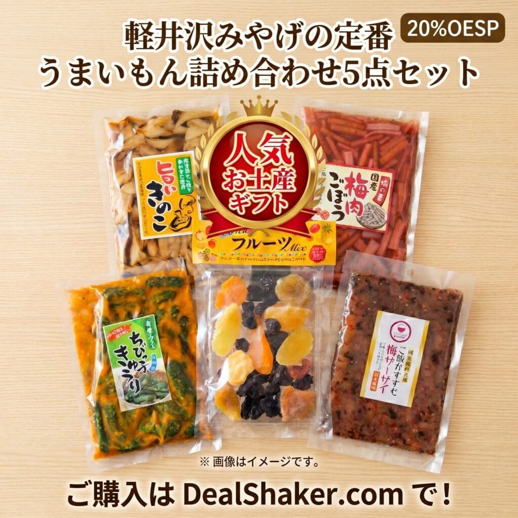 軽井沢の人気土産を厳選した「うまいもん」5点セット。地元の名物を一箱で楽しめる贅沢な詰め合わせで、贈り物や手土産に喜ばれる一品です。
